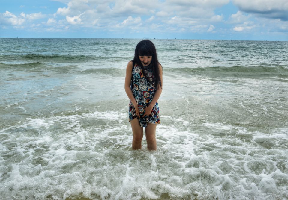 我们在国内看见大海的次数不多,而且国内海滩景区人满为患,常常是下饺子的既视感,很难找到海阔天空的感觉。夏威夷海滩虽然不大,但是天蓝海静,令人心旷神怡。在这里玩耍的主要是柬埔寨人,外国游客极少。孩子们在海里戏水,大人们在沙滩上烧烤喝酒,十分惬意。呼吸着新鲜的空气,人的心情格外舒畅。我们欣喜地玩沙子,找贝壳,踏海浪。我还和一只少了一个钳子的小螃蟹进行了搏斗,它十分凶猛,挥舞着钳子,不甘示弱,突然一阵海浪袭来,小螃蟹趁机逃掉了。海港的雨捉摸不定,哗啦啦落了下来,我们赶紧回到车上,去往下一处海滩。