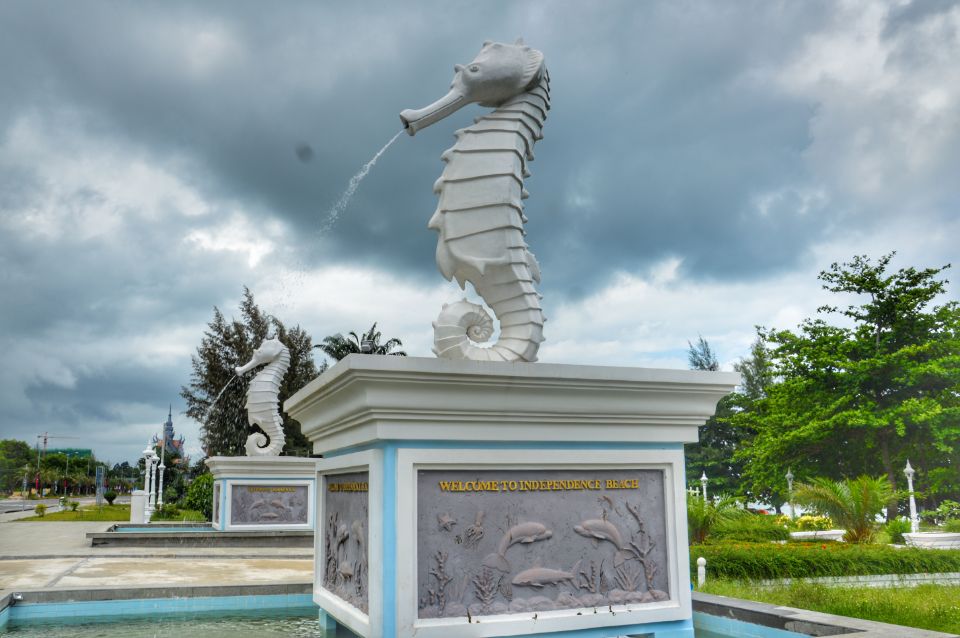 独立海滩被我们认为是在游玩过的西港海滩中最好的了。车停在独立海滩时,雨已经停歇了。两只喷水的海马在入口迎接着我们。细沙软绵绵的,走在上面就像踩在绒毯上一样。海滩很大,游客不多,浪在风的吹动下,一波一波地向我们袭来,我们迎着翻滚而来的海浪跳跃着,奔跑着,仿佛在与大海嬉闹——你就是打不到我。遗憾的是,我们今天都没带上泳装,不敢下海戏水。如果你喜欢的,快乘暹粒到北京的航班来目睹这个奇观吧!